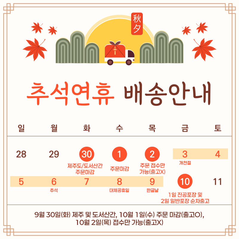 10월부터 추석 및 연휴들로 긴 연휴가 시작됩니다. 배송 안내 드립니다.